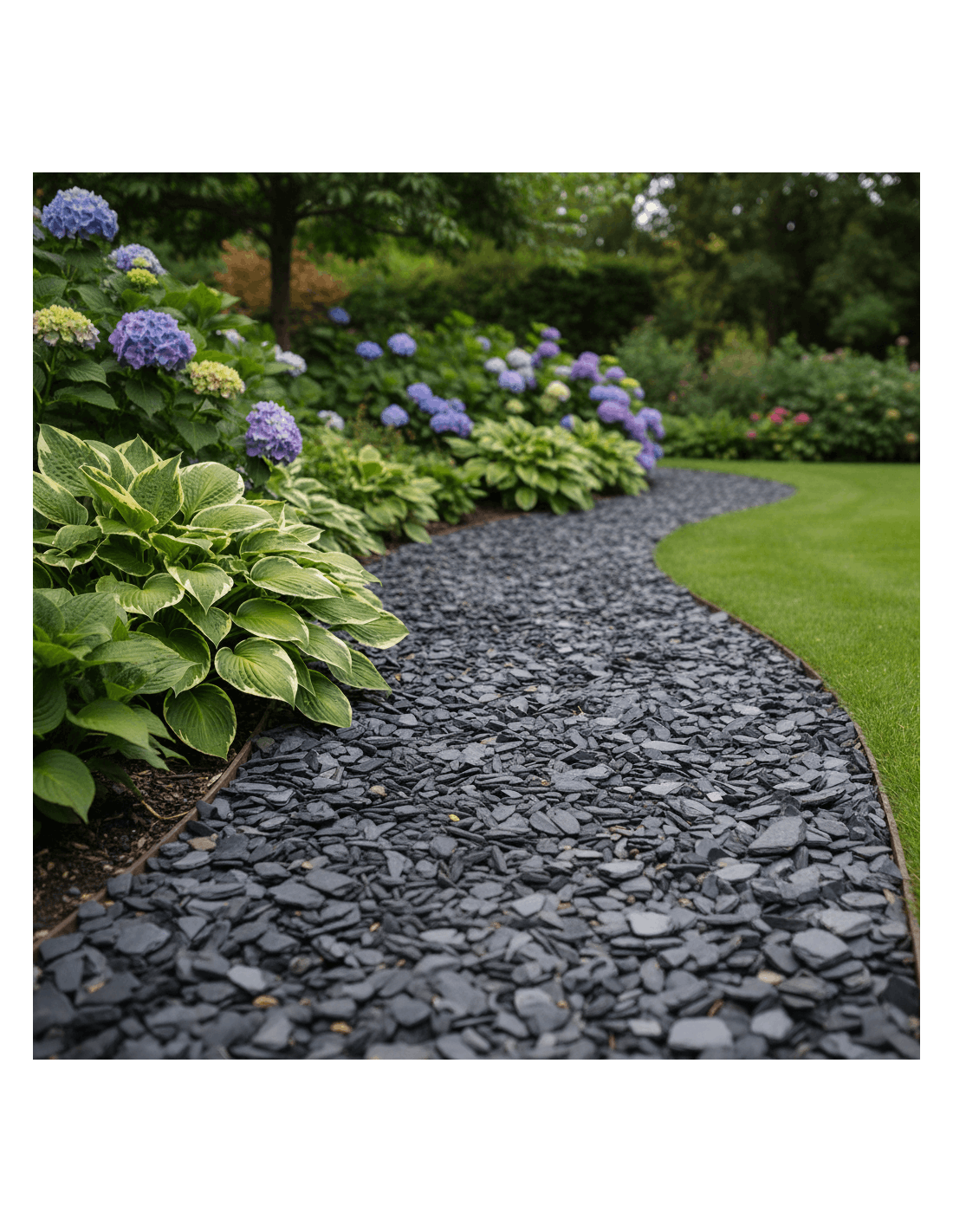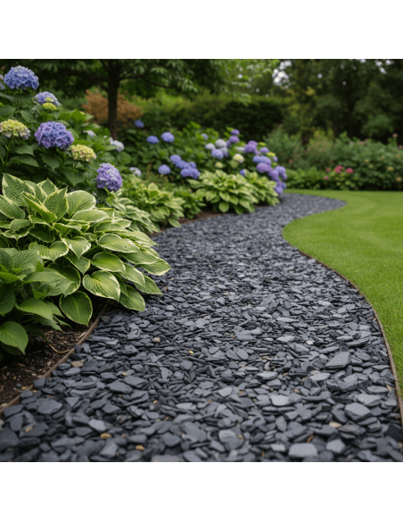L’ardoise noire, ou Black Slate, est une pierre naturelle plate utilisée comme paillage décoratif pour les allées, bordures et zones paysagères.