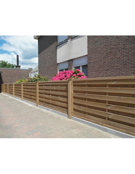 Het Reliëf scherm wordt bevestigd met 6 hechtingen aan houten palen of met 6 beugels aan metalen palen. Dankzij de drukimpregnatie is het hout beschermd tegen vocht en schimmels. Voor een langere levensduur kan het scherm optioneel behandeld worden met een geschikte beits of olie.