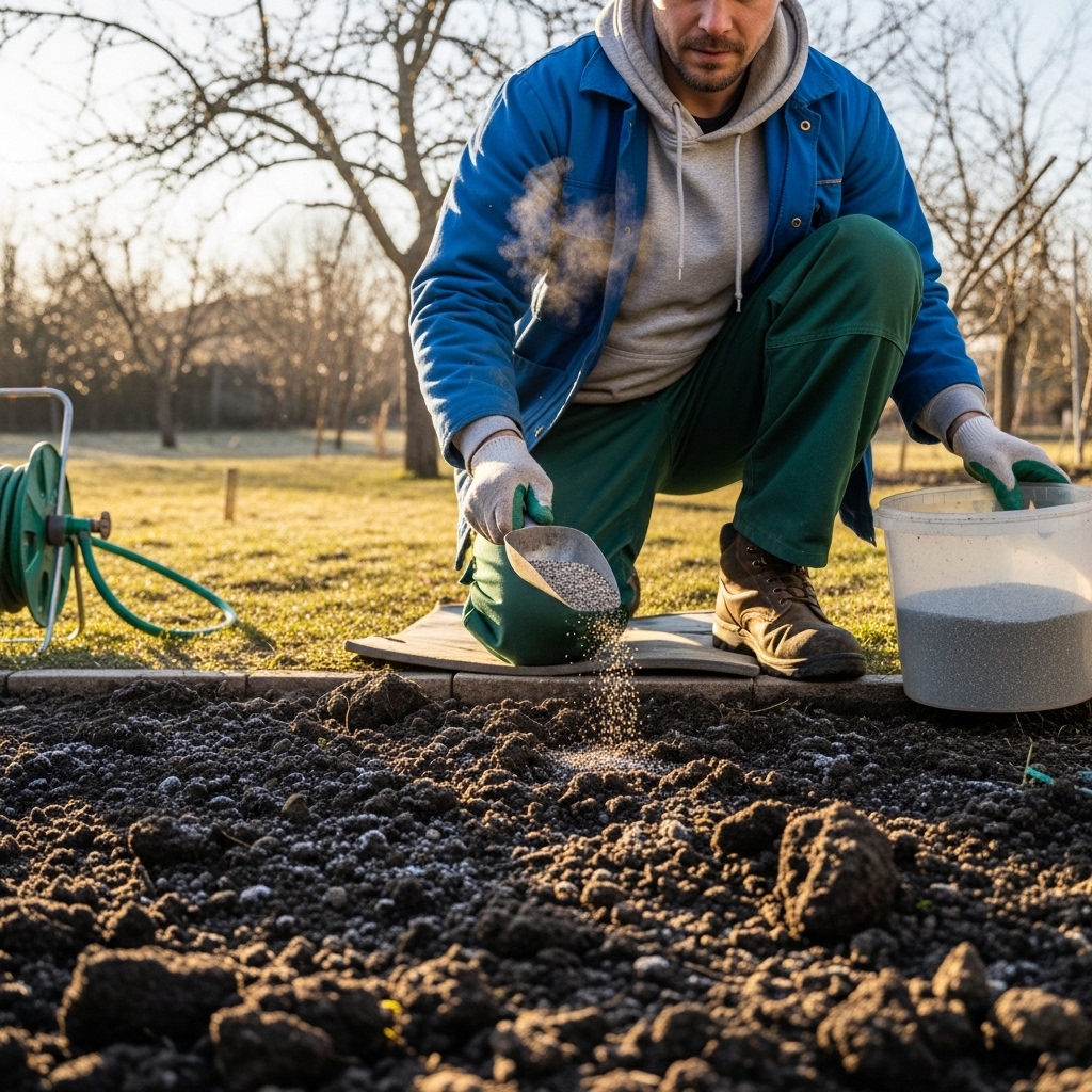 Bemesten – Strooi gazonmest geschikt voor het vroege groeiseizoen om het gras te voeden, een diepe groene kleur te geven en de weerstand tegen ziekten te verhogen.