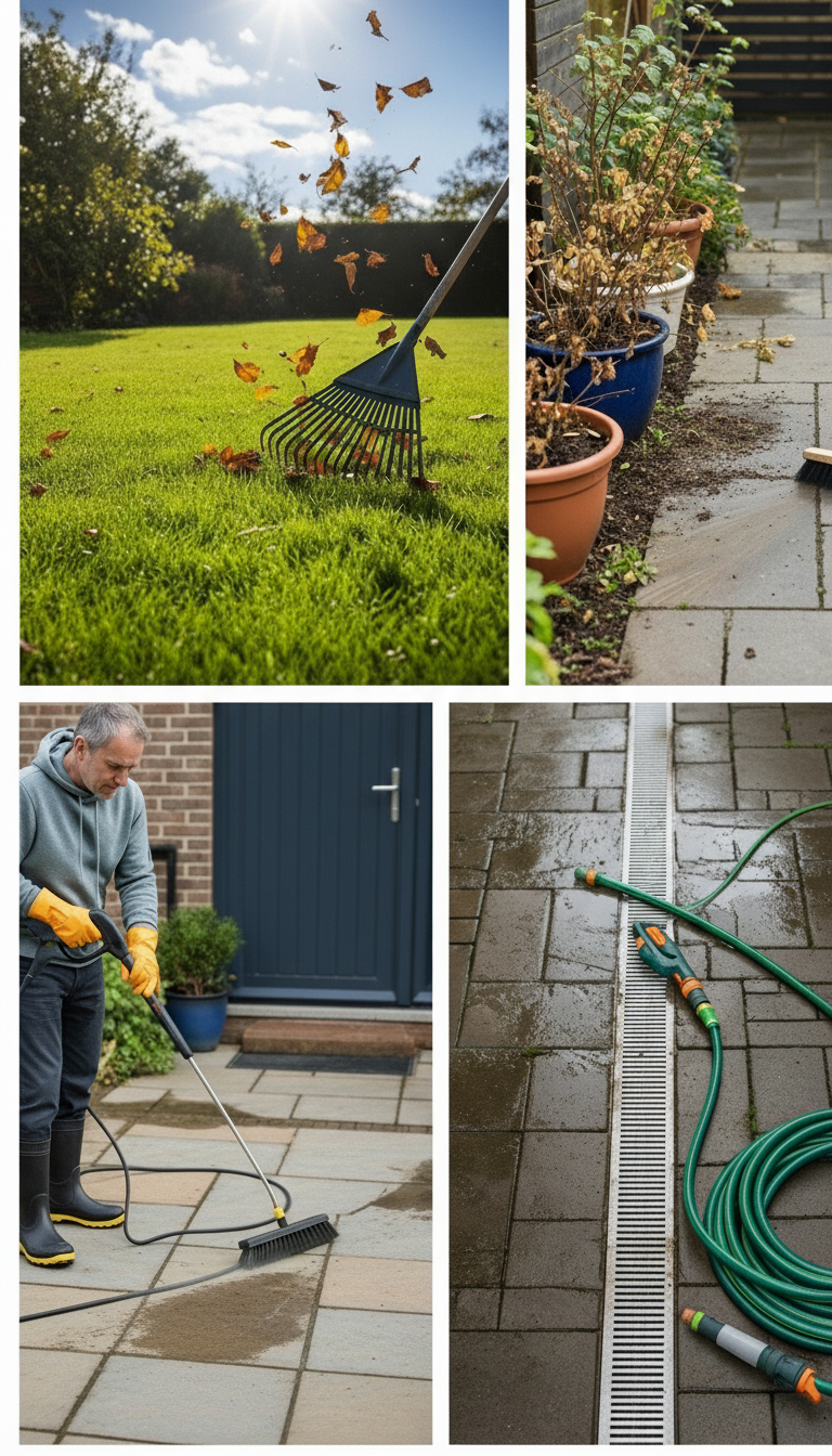 Maak terrassen en tuinpaden schoon – Gebruik een bezem of, bij hardnekkig vuil, een hogedrukreiniger. Zo verwijder je mos en modder, waardoor je tuin er meteen verzorgder uitziet en je valgevaar beperkt wordt.