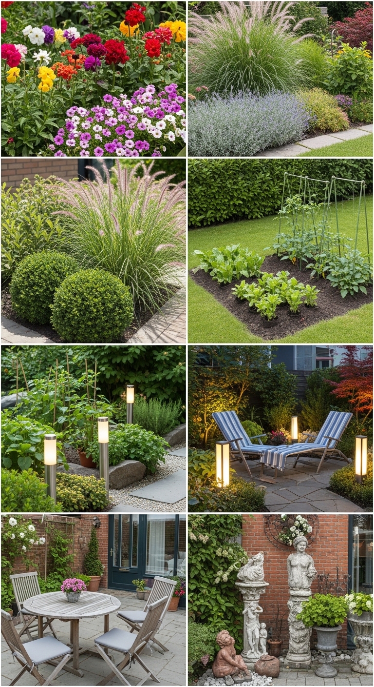 Decoratieve elementen – Voeg bijvoorbeeld een vogelbad, windgong of tuinbeelden toe voor extra sfeer en een persoonlijke touch.