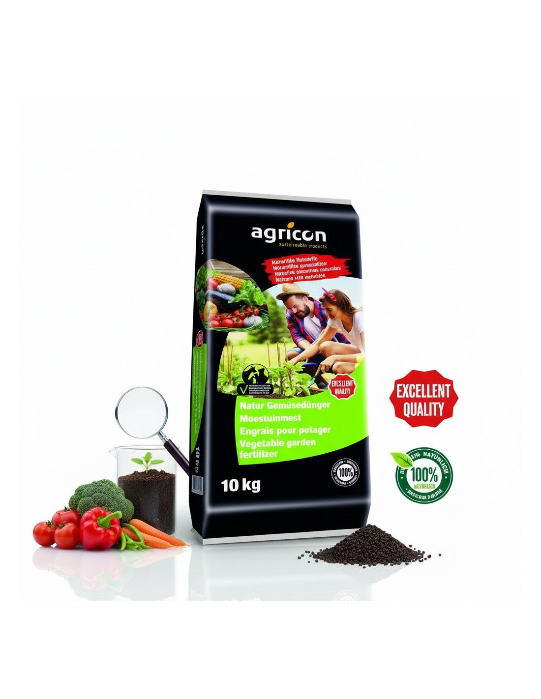 Agricon organische moestuinmest 10kg is een gedroogde, gekorrelde champostmest met een hoog humusgehalte. Ze verbetert zware zand‑ en leembodems, activeert het bodemleven en voedt de moestuin, groente‑ en plantentuin op een natuurlijke manier.