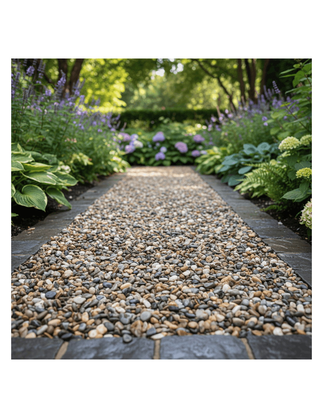- Plaats afboording, indien gewenst, om de grind van de tuin te scheiden. (hou hierbij rekening bij het uitgraven).