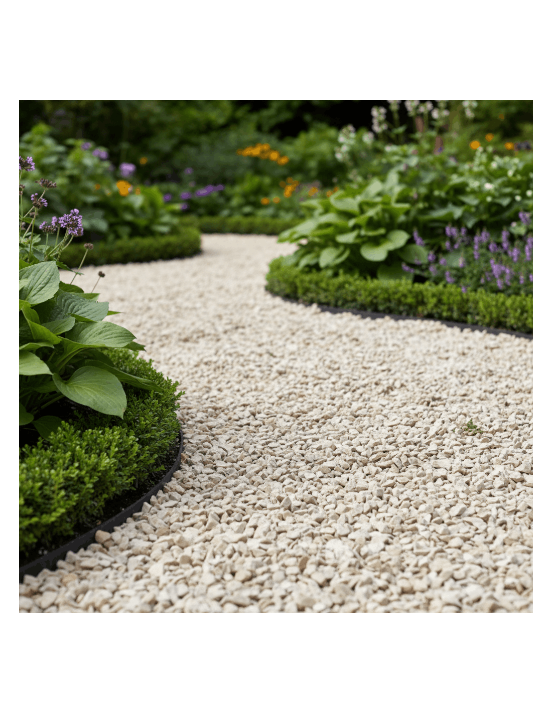 - Plaats afboording, indien gewenst, om de grind van de tuin te scheiden. (hou hierbij rekening bij het uitgraven).