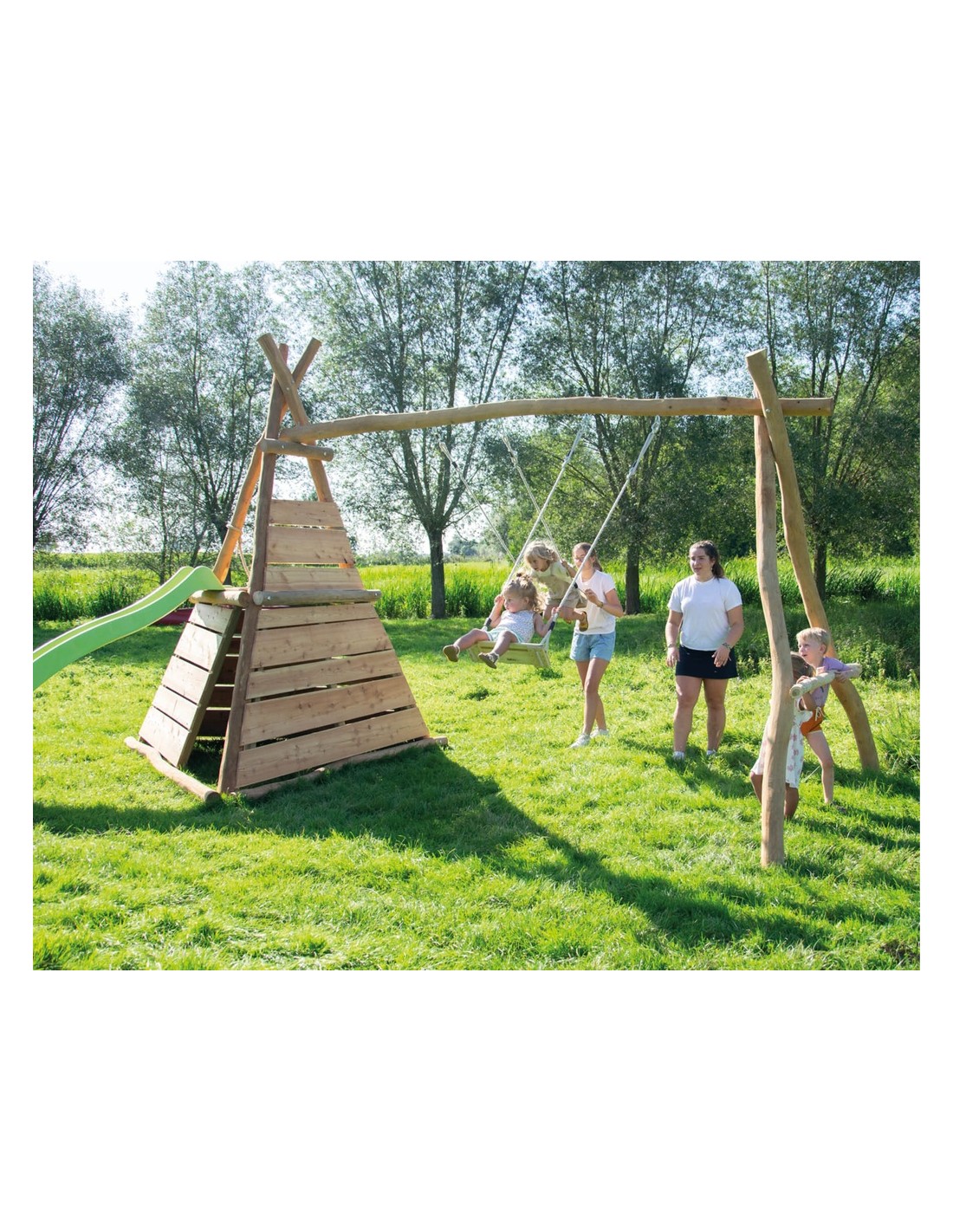 De Tipi met Dubbele Schommel is een uniek en avontuurlijk speeltoestel dat actief spelen combineert met fantasierijk ontdekken. Ideaal voor tuinen, speelpleinen en recreatiegebieden waar kinderen zich volledig kunnen uitleven.