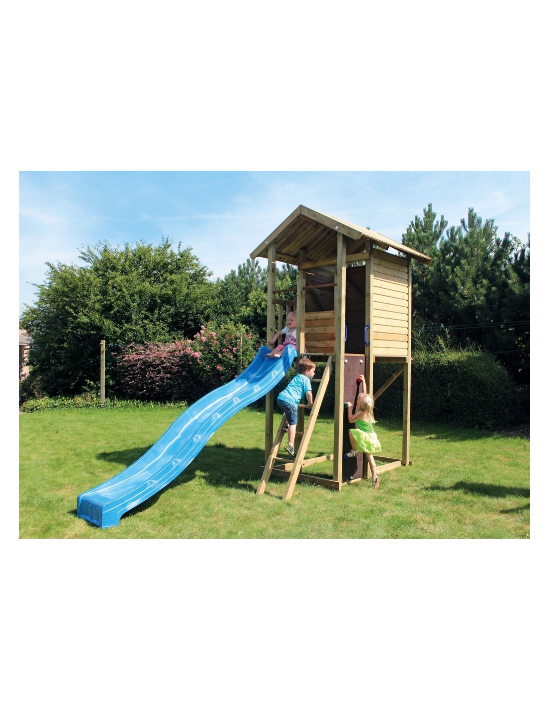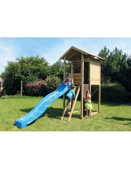Het basistoestel is uitgerust met een trap en een klimmuur met klimgrepen, wat zorgt voor actieve en uitdagende speelmogelijkheden. Voor optimale veiligheid en stabiliteit zijn een glijbaan en 4 grondankers verplicht bij aan te kopen. De boomhut is bovendien uitbreidbaar met extra modules en toebehoren.